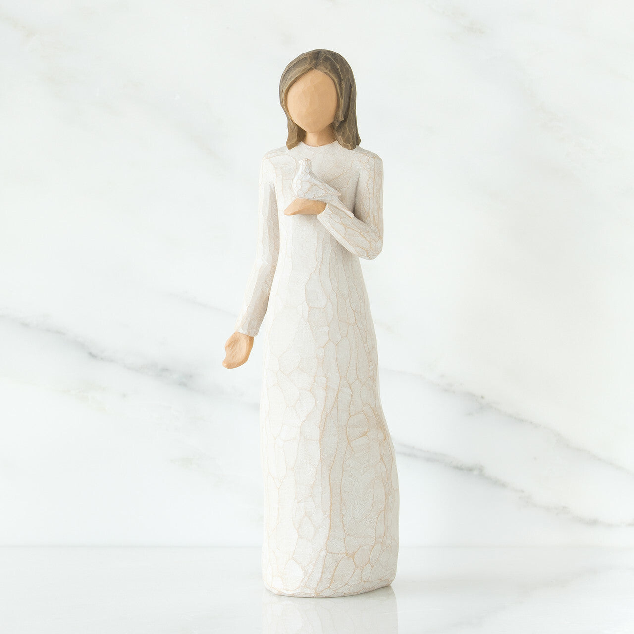 This iconic figure of peace and serenity is a tangible reminder of healing, comfort, hopefulness and remembrance in times of sorrow. "Her gesture is one of openness and reflection; the white dove embodies inner beauty and peace." –Susan Lordi