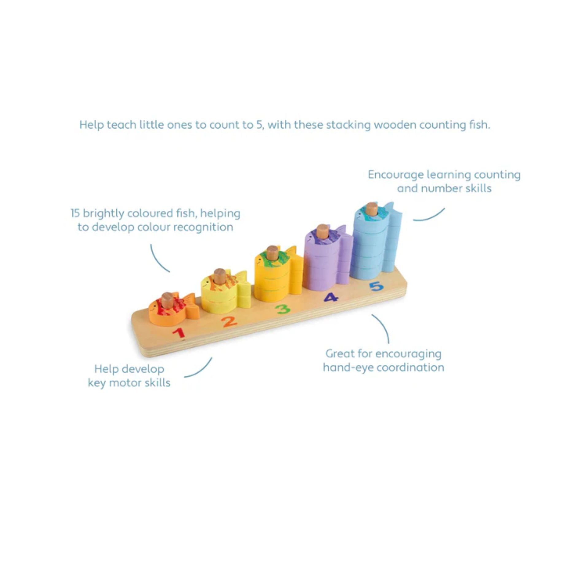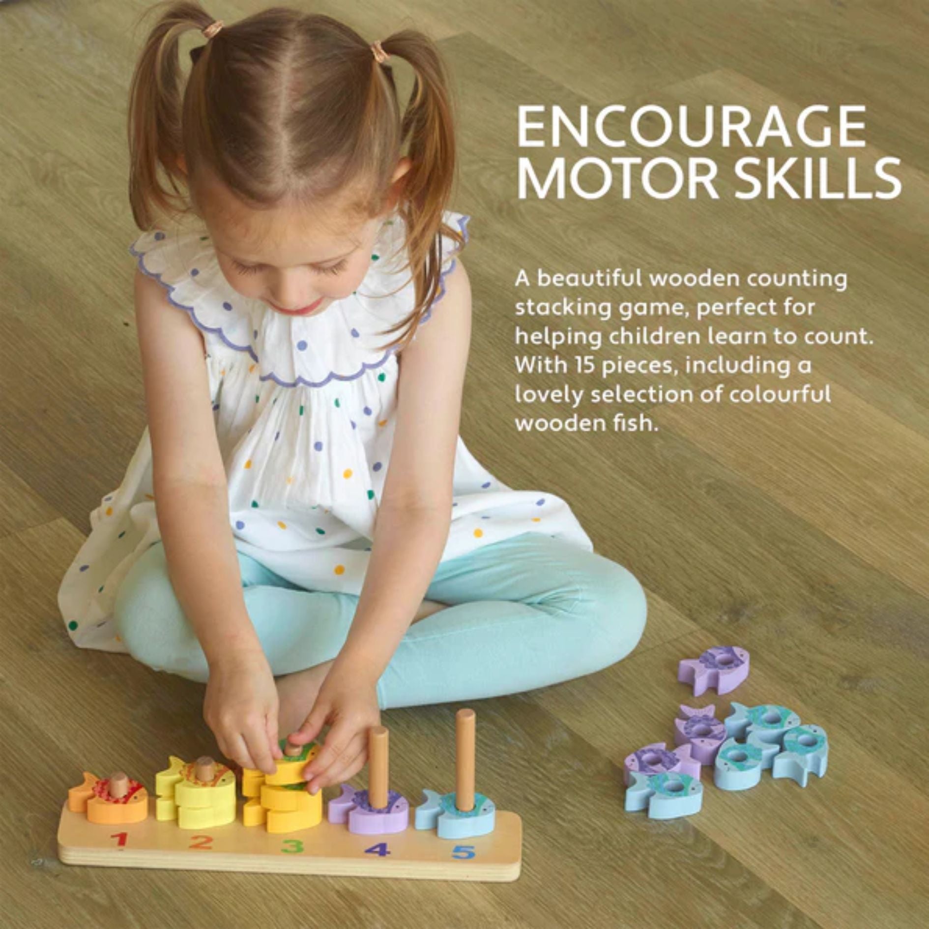 Help teach little ones to count to 5 with these adorable stacking fish! This set includes 15 brightly colored fish, offering hours of fun while stimulating key motor skills and aiding in color recognition. Presented in a beautifully designed box featuring sea creatures and colorful illustrations, this set makes a perfect gift. The packaging is fully recyclable, making it an eco-friendly choice for any occasion.