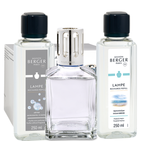 The Essential Gift Pack is the perfect introduction to the Maison Berger ritual. This starter kit includes a glass lamp, wick-burner, shiny silver straight heavy diffuser cap, stopper cap, and funnel, as well as two 250 ml home fragrances: Ocean Breeze and So Neutral.
